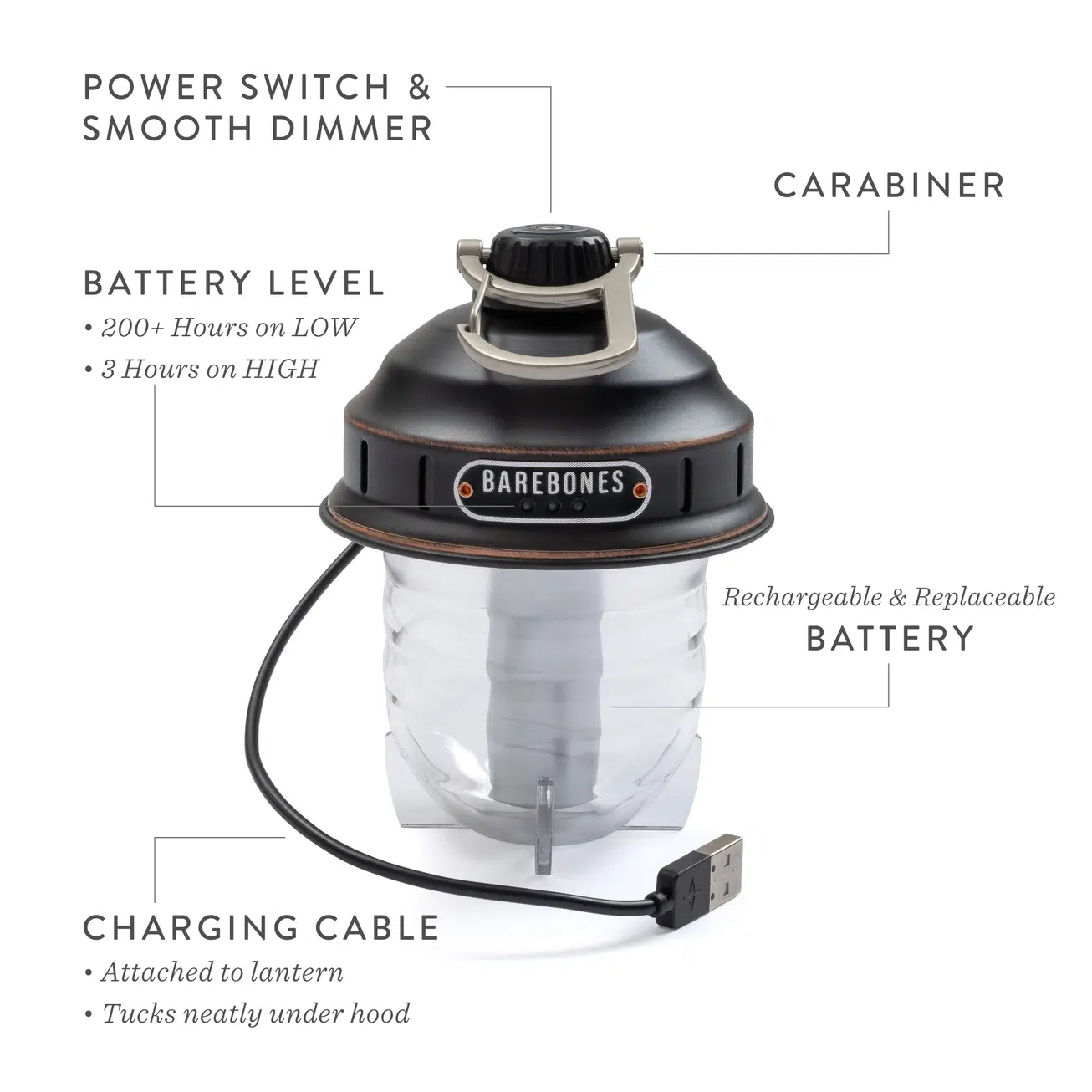 Hanging on this light is a snap with its carabiner top, and standing is a cinch with its sturdy base. Comes with a 30″ cord for its rechargeable battery, which lasts 200+ hours on low or three hours on high. Also has a convenient battery life indicator. Dimensions: 6” x 3″.